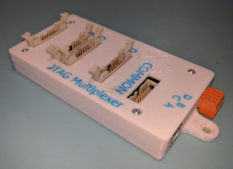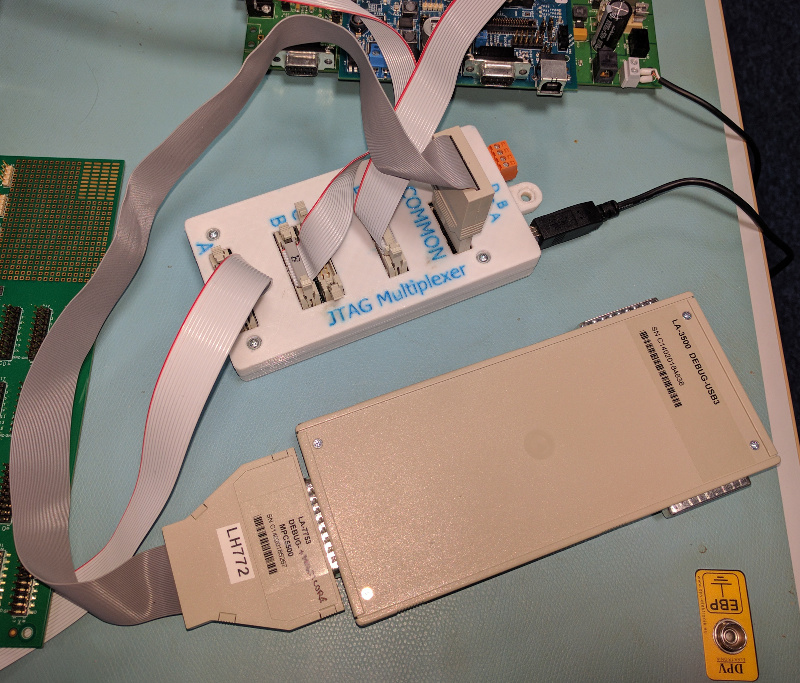 While working in embedded software development, I found a need for something that would connect our expensive scripted debugger (e.g. Lauterbach) to one of several development boards. There seemed to be nothing available commercially, so I made one. It is USB controlled, has four ports, and comes in different versions for different target hardwares. There are 14 way and 16 way IDC connector versions available. It also provides two auxilliary on/off relay contacts. We used it in our "Jenkins" rig to switch between boards during our nightly testing. It was generally reliable, for some hardwares we had to reduce the JTAG clock frequency.