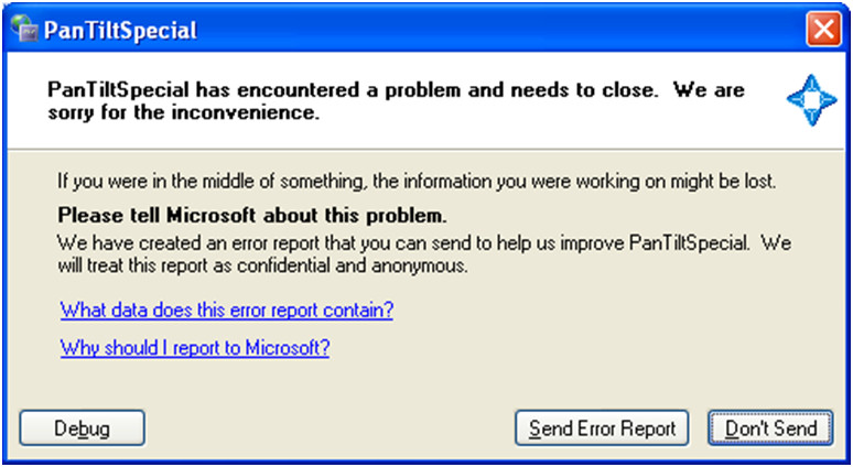 If you get this error message when running the Pan Tilt Special (for LANC and Zoom Relays) software on WindowsXP, then see below: